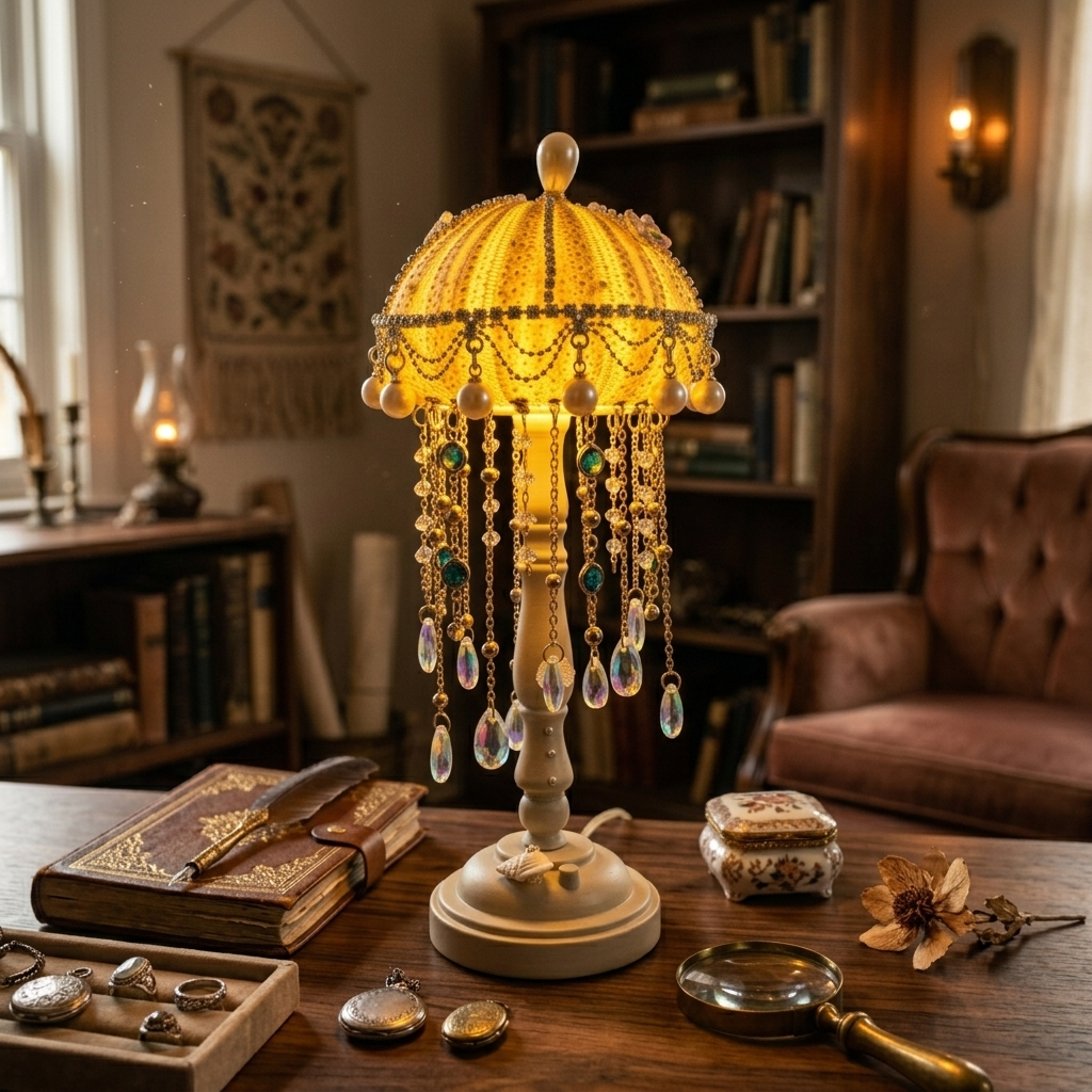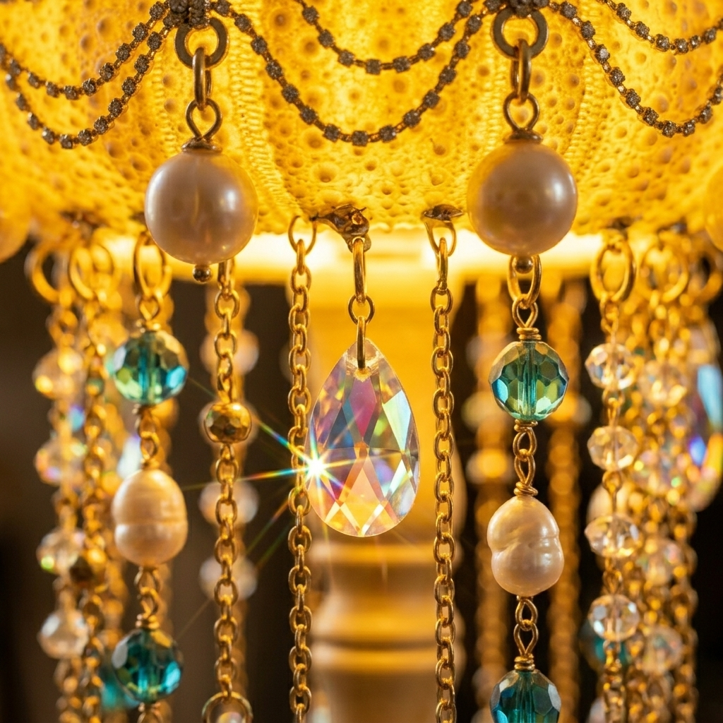 Inspired by the delicate beauty of sea urchins, this lamp combines natural texture with vintage elegance. The intricate bead chains and crystal drops shimmer beautifully under the warm light, creating a calming and magical atmosphere.